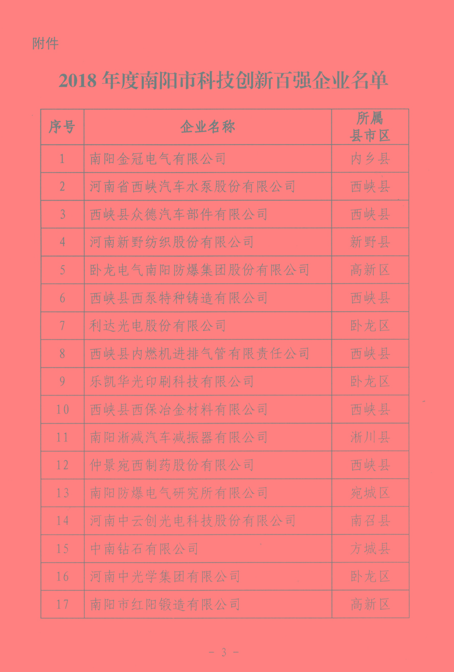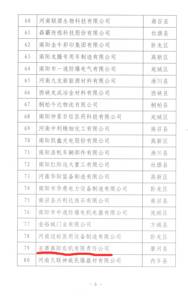 為深入實(shí)施創(chuàng )新驅動(dòng)發(fā)展和“兩輪兩翼”發(fā)展戰略,增強全市企業(yè)自主創(chuàng )新能力和核心競爭力,引領(lǐng)促進(jìn)企業(yè)成為技術(shù)創(chuàng )新主體,按照《南陽(yáng)市科技創(chuàng )新百強企業(yè)考核評定辦法》要求,亞澳農機等6家企業(yè)榮獲此榮譽(yù)。