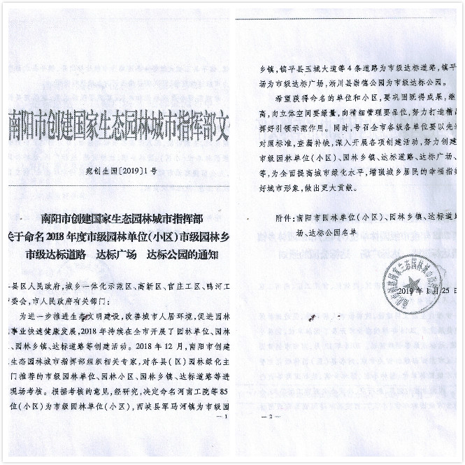 此次我公司喜獲 “南陽(yáng)市園林式單位”的榮譽(yù)稱(chēng)號,是市級主管部門(mén)對我公司優(yōu)美的綠色生態(tài)環(huán)境和園林綠化建設維護工作的高度肯定。我們會(huì )以此為新起點(diǎn),不斷加強生態(tài)環(huán)境建設和綠化養護管理工作,使廠(chǎng)區綠化特色更加顯現,廠(chǎng)區綠化品位更上檔次,打造出更加優(yōu)美的生態(tài)園林廠(chǎng)區環(huán)境,為“國家綠色工廠(chǎng)”做好基礎。