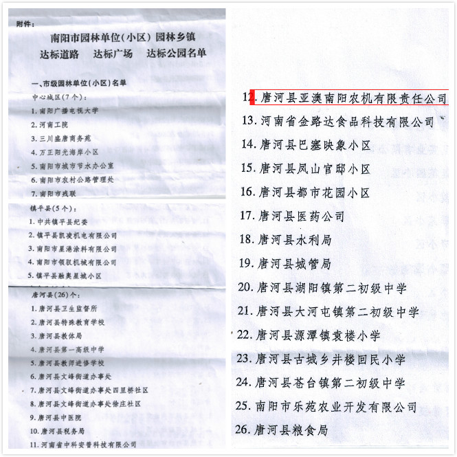近日,南陽(yáng)市公布了2018年度全市園林式居住區(單位)評選結果,亞澳南陽(yáng)農機有限責任公司榜上有名,榮獲市級“園林式單位”榮譽(yù)稱(chēng)號。