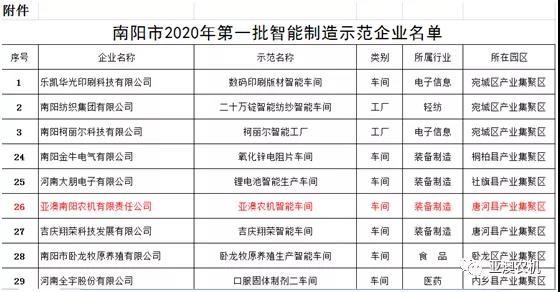 南陽(yáng)市2020年第一批智能制造示范企業(yè)名單公布, 亞澳農機入選