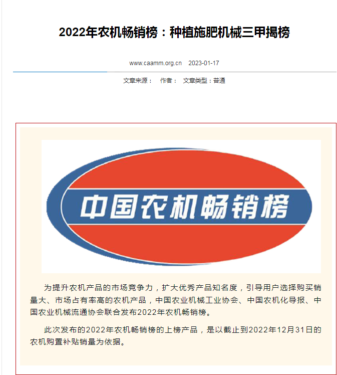 亞澳農機榮獲2022年耕整地機械和 種植施肥機械農機暢銷(xiāo)三甲榜
