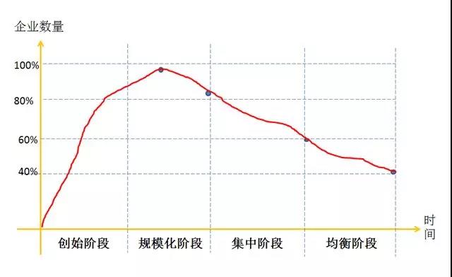 在一個(gè)行業(yè),從長(cháng)期看,企業(yè)要存活下來(lái)就要有超出平均水平的成本控制能力。管理學(xué)家陳春花認為一個(gè)行業(yè)內企業(yè)數量和時(shí)間軸之間的關(guān)系可以通過(guò)四個(gè)發(fā)展階段來(lái)說(shuō)明:初創(chuàng )階段、規?;A段企業(yè)數量一直上升,規?;笃谄髽I(yè)數量達到頂峰,開(kāi)始有擠出效應,約20%企業(yè)出局,到集中階段又有20%企業(yè)出局,到均衡階段還要淘汰20%,最后的競爭就在剩下的40%企業(yè)之間展開(kāi)。