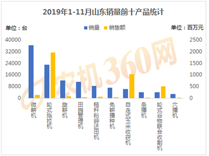 2019年1-11月,上榜山東用戶(hù)購機量前十的農機產(chǎn)品如下圖所示,微耕機、輪式拖拉機、旋耕機等10種農機合計購買(mǎi)力11.5萬(wàn)多臺,是山東農機總銷(xiāo)量的86.54%,對這10類(lèi)農機的購機支出達38.55億元。