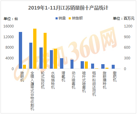 2019年1-11月,上榜江蘇用戶(hù)購機量前十的農機產(chǎn)品如下圖所示,旋耕機、全喂入履帶式谷物收、輪式拖拉機等10種農機合計購買(mǎi)力5.45萬(wàn)臺,是江蘇農機銷(xiāo)量的85.35%,對這10類(lèi)農機的購機支出達31.02億元。