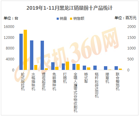 2019年1-11月,上榜黑龍江用戶(hù)購機量前十的農機產(chǎn)品如下圖所示,輪式拖拉機、水稻插秧機、埋茬起漿機等10種農機合計購買(mǎi)力4.9萬(wàn)臺,是黑龍江農機銷(xiāo)量的93.09%,對這10類(lèi)農機的購機支出達32.23億元。